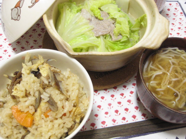 この日の夕飯は干しキノコの炊き込みご飯を作ったので、おかずは淡泊めのものがいいなーと思い、蒸し鍋にしました。白菜がたくさんあったので、この日は白菜で。ポン酢をかけていただきました。これに味噌汁はもやしの味噌汁で。