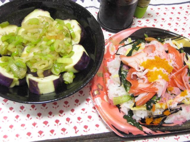 この日は野菜をたっぷり目に取りたかったのが一つと、ご飯がなかったので、出来合いのカニちらし寿司を購入したのもあり、こうなりました。この蒸し茄子料理だと、この一皿で200gくらい余裕な上に、簡単なので茄子のストックがある時はホント便利です。