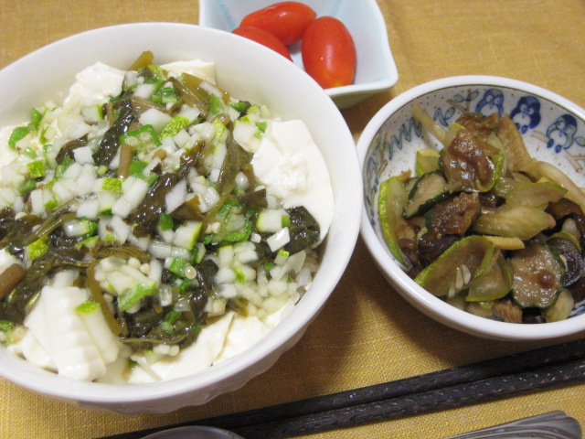副菜はこれまた作り置きのキュウリと茄子の浅漬け風に冷やしたプチトマト。あと写ってないですが、鯖缶の残りも。