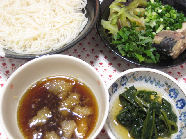 素麺は薬味にネギと青シソの他、具として蒸し茄子と鯖の水煮を。