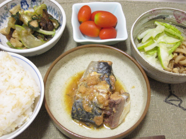 副菜はキュウリと水ナスの浅漬け風、モロヘイヤのおひたしで。