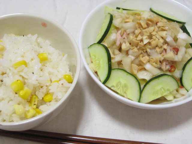 昨日は暑さの所為か、主菜まで食べられそうもなかったので、その分サラダに若干ボリュームのあるおかずサラダと、トウモロコシのおこわにしました。