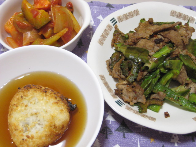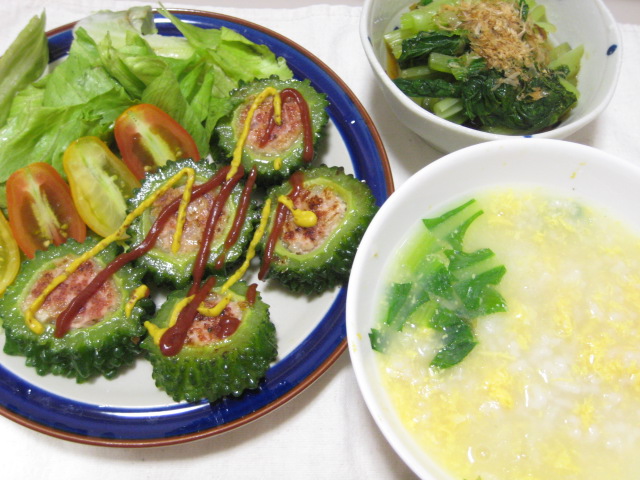 昨日の夕飯。肉詰めはゴーヤだと、ちょっと肉っぽさが弱いかな…ピーマンの方が主菜としては食べ応えがある気がします(ゴーヤの肉詰めはスープ煮がやっぱ一番だと)。
