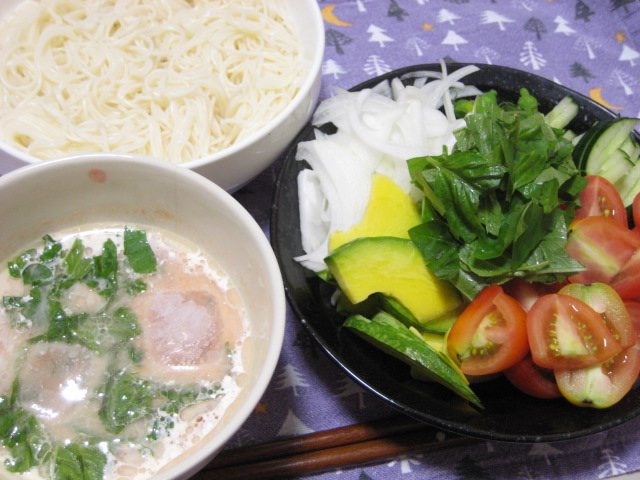 暑いし、朝から野菜不足だったので、両方を満たす為に、こうしてみました。つけ汁はめんつゆベースにマヨネーズとトマト、オイル付のツナで。具はトマト、キュウリ、サラダかぼちゃ、玉ねぎ、カボチャの花、バジルで。