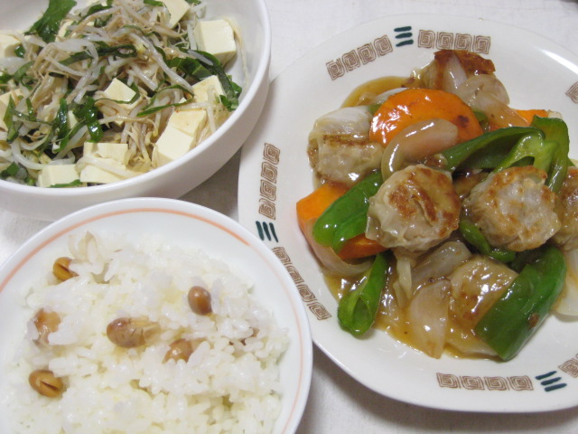 この日は買ってあったチルドのシュウマイを使っての甘酢あんかけがメイン。副菜はもやしと豆腐干のサラダ。ご飯は煎り大豆ご飯にしてみました。