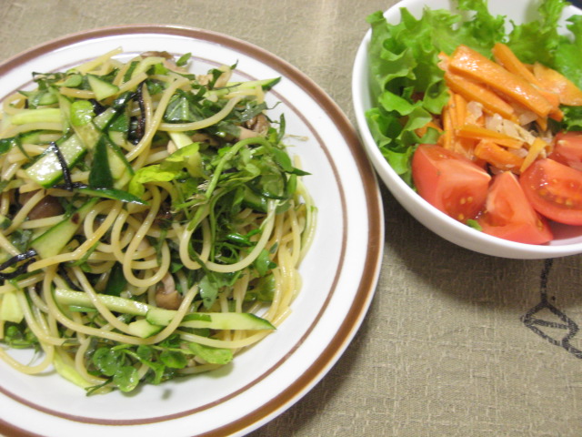 ベランダで茂りまくっている青シソを少しでも消化するべく(苦笑)もうちょっと野菜分を増やしたかったので、キュウリの千切りも入れてます。なのでやたら嵩高いんですが、パスタの量は普通よりもちょっと少ないくらい。