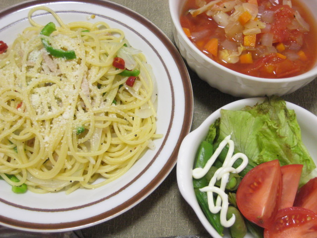ペペロンチーノ、トマトベースの野菜スープ、野菜サラダで。