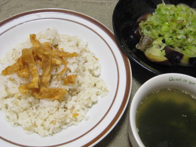 6月最後の夕飯。塩鶏と生姜のピラフ、蒸し茄子のネギソースがけ、わかめスープに、ここには写ってませんが冷やしトマトで。