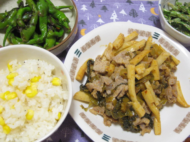 高菜と豚肉の炒め物、焼き甘長唐辛子のおかかびたし、ニラのマヨぽんおかか和えと、トウモロコシのおこわで。