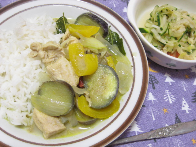 この日の夕飯はグリーンカレー(ご飯はジャスミンライスで)と、思い立って作ってみた和風コールスローサラダで。