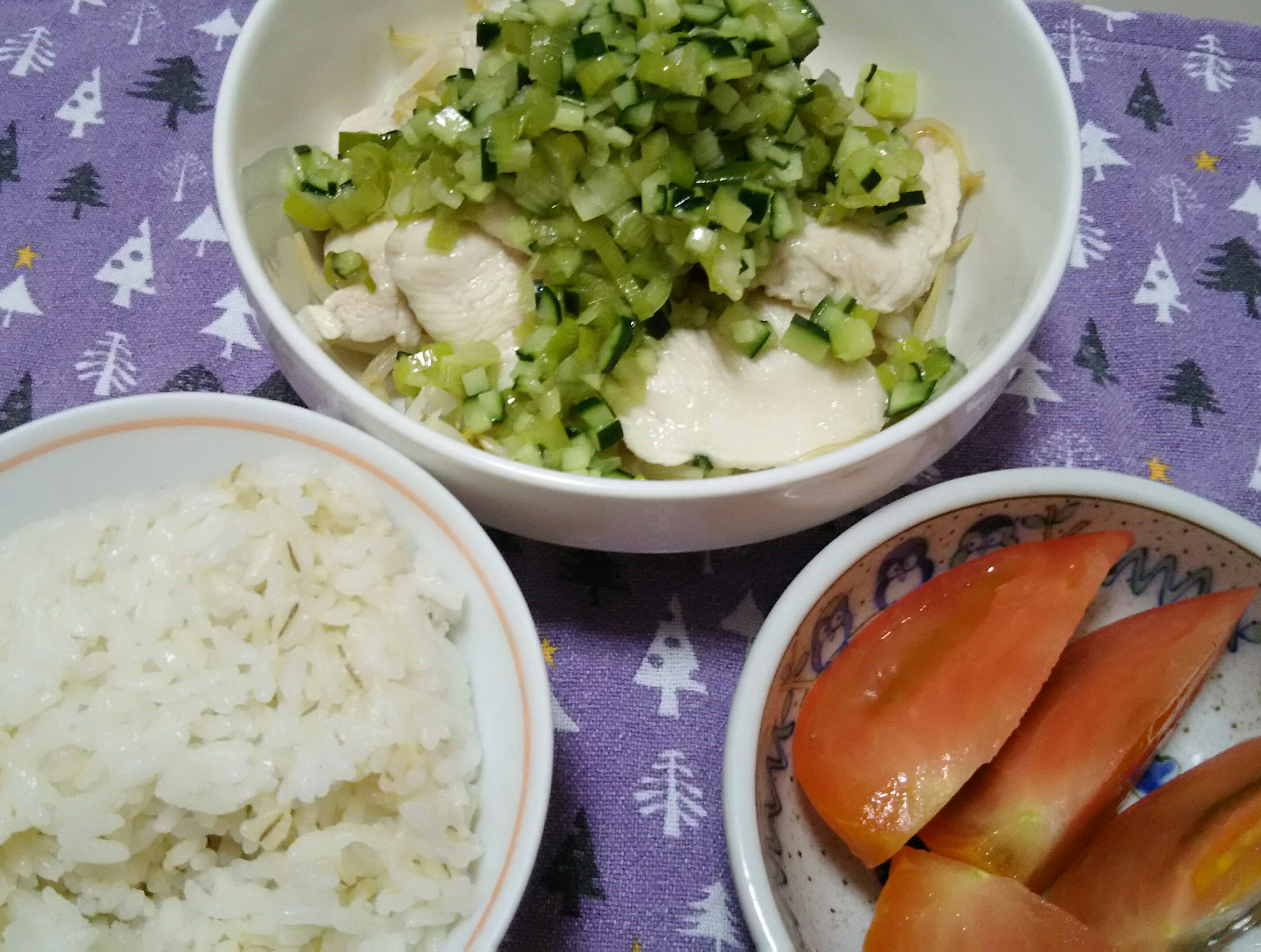 鶏むね肉の冷しゃぶ風、冷やしトマト。