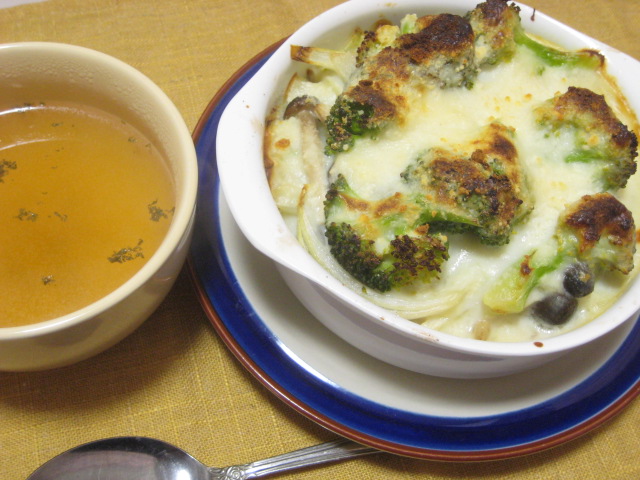 5月最初の夕飯。月明けなので、例によってストック食材の消化という事で、牛乳と冷凍のブロッコリー、あと冷やご飯があったので、それをまとめた結果です(笑)うちではグラタンやドリアの時は、大抵自家製のパンチェッタを使うので(塩分が強いので細かく刻んだのを少しだけ)、他の肉類は使わずに具は野菜主体になってます。この日のもブロッコリー以外に玉ねぎとセロリ、しめじです。