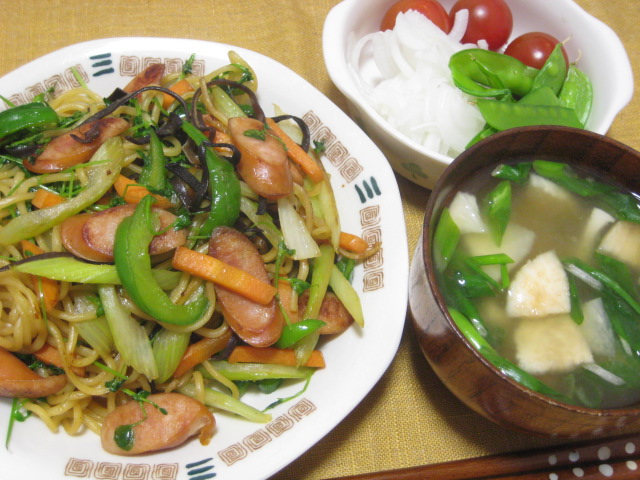 スーパーで中華風の焼きそばが売っていたので、それを買って作ってみました。味付けとしてはオイスターソースベースの甘辛味です。野菜は家にあるもの(豆苗、セロリ、ニンジン、ピーマン)に他はキクラゲ、ソーセージで。意外と良かったです。