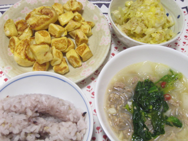 昨日の夕飯。麩チャンプルーは使った麩の大きさが二種類あったのもあって、なんだか炒り卵っぽく見えるかも。副菜は作り置きの塩だれキャベツ。スープは豚ひき肉と大根のエスニック風スープ。仕上げに茹でで刻んだほうれん草をトッピングしてみました。