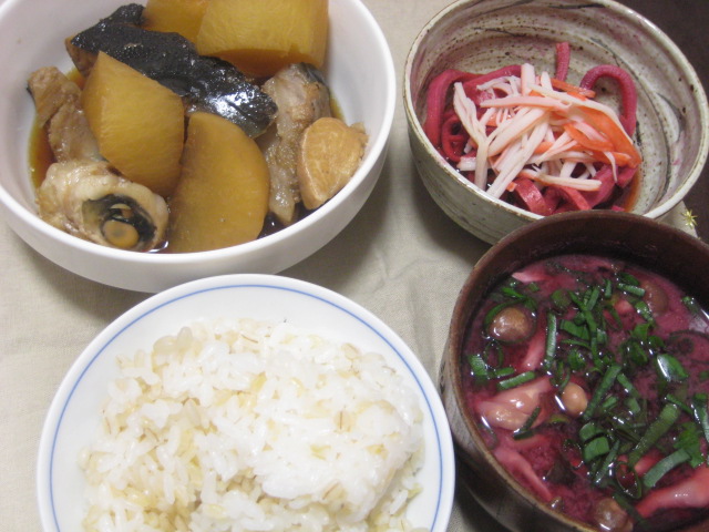 昨日の夕飯。ブリ大根に、切り干し大根とカニかまの酢の物、しめじの味噌汁。