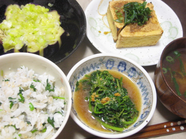 おかずは奥左から蒸し茄子のネギソースかけ、厚揚げのレモングラスがけ、長ネギの味噌汁、クレソンと水菜のピーナツびたし。この中でベランダで収穫したのはクレソンと水菜。あとは青ネギです。