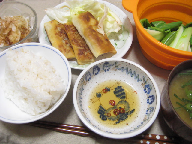 昨日の夕飯。前に余分にできた分を冷凍していた春巻を冷凍庫の整理を兼ねて。弁当用にでもしようかと思ったんですが、結局使う機会がないまま契約期間が終わったので、ここで使ってしまいます。