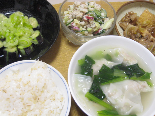 茄子のネギソースがけはときどき無性に食べたくなります。シンプルだけど、美味しい。ご飯が欲しくなる味だし、夏ならビールとか欲しいですね。水餃子と小松菜のスープは、昨日の肉詰めのタネが残ったので、それを流用しました。