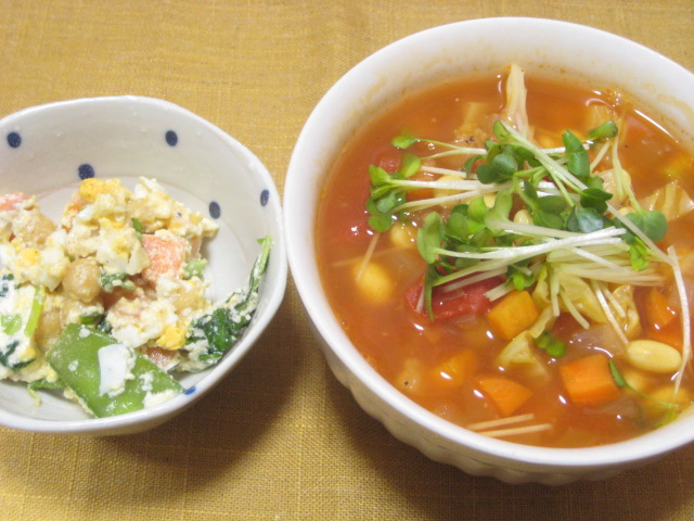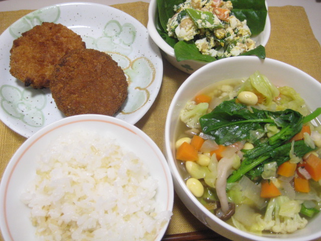 昨日は休みだったので、ちゃんと作るつもりだったんですが、まぁいろいろあって、こんな具合に(苦笑)当日作ったのは豆と野菜のスープだけで、サラダは作り置きの豆腐の白和え風サラダ、揚げ物は出来合いのミンチカツとチキンカツでした。