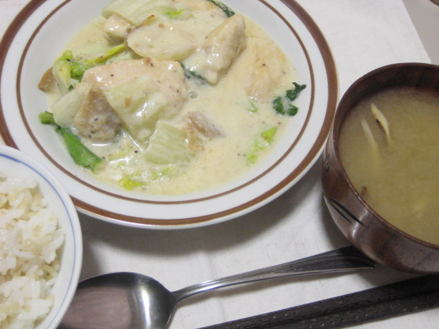 月末なので、ストック品での夕飯。主菜は鶏むね肉と白菜のクリーム煮、汁物は干しゴボウの味噌汁で。