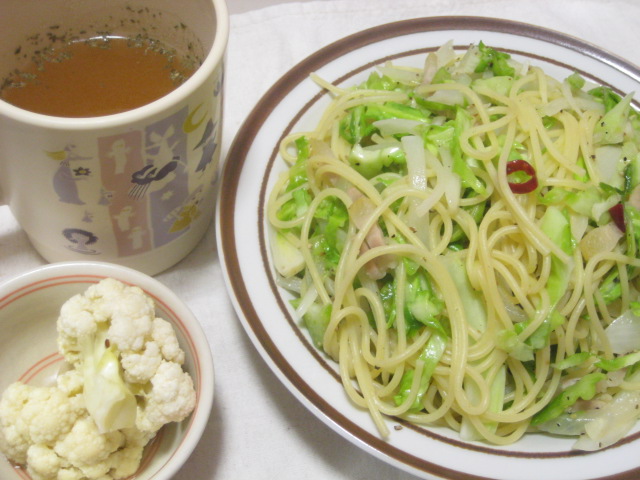 昨日の夕飯(2/28):キャベツ入りペペロンチーノ他