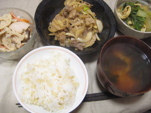 メインは豚の生姜焼き。副菜は白菜と油揚げの煮物、ゴボウサラダ。