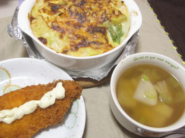 これに買ってきたサーモンフライと、蕪のスープで。