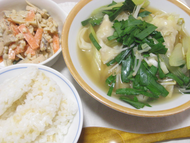 この日は買い置きしていたチルドのスープ餃子に野菜をどっさり入れたものと、作り置きのゴボウサラダで。