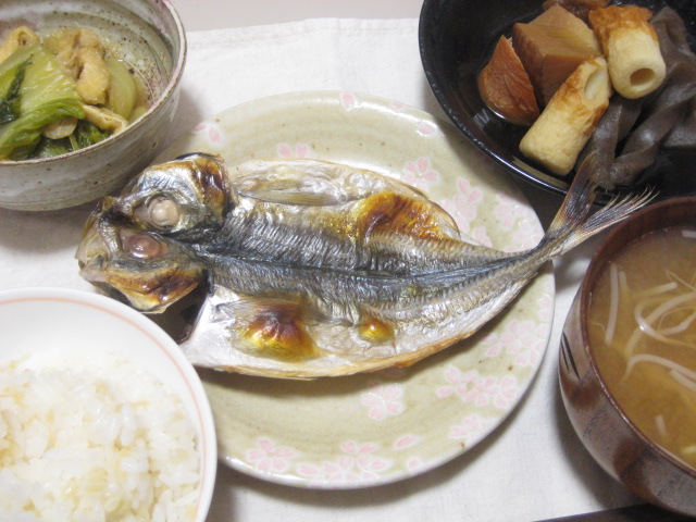 昨日の夕飯。焼き魚はアジの開き。他、副菜として、凍み大根とコンニャクの煮物、作り置きの白菜と油揚げの煮物、もやしの味噌汁で。