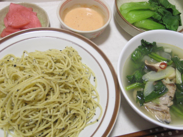 昨日の夕飯。ゴマのパスタと、蒸し青梗菜、蕪と紅大根のピクルス、春菊と魚のスープでした。