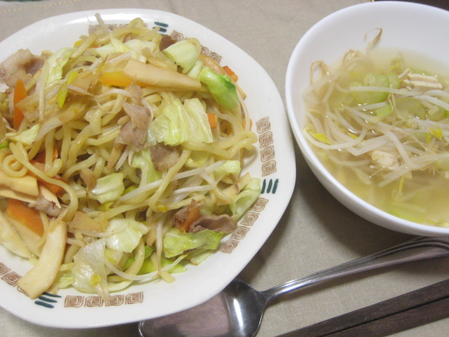 この日は塩焼きそばと、もやしと塩鶏のスープで。