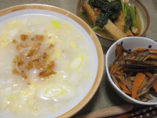 副菜は昨夜の残りの小松菜の煮物と、ゴボウとニンジンのキンピラ。炒め油には粥のトッピングに使った鶏皮せんべいを作る際に出た鶏油を使いました。味もいいし、無駄が出ないので、こうした流用は好きだったりします。
