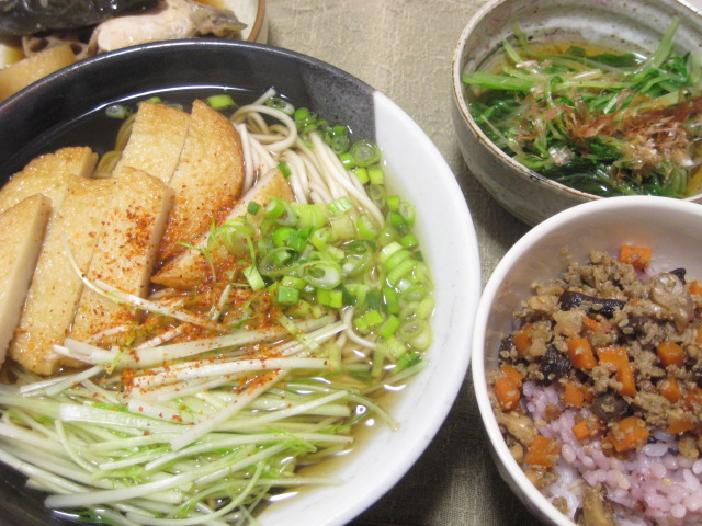 で、当初は別のメニューにする予定で仕込みはできてたんですが、この余りの寒さに熱い食べ物を欲してしまったので、急遽内容変更。メインはにゅうめんで、その他に水菜のおひたし、つばすの煮付け(作り置き)、雑穀ご飯には豆腐そぼろをのせて。