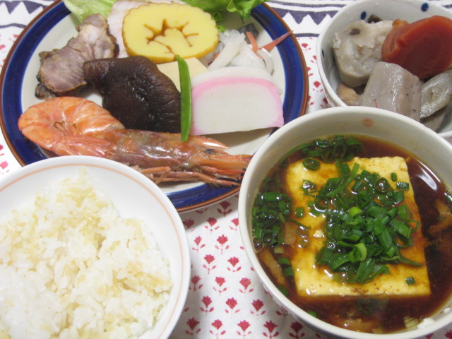 元旦はお昼に実家へ行って、家族揃っておせちを食べるのが恒例なのですが、帰りに小さい重箱を渡されるので、この日の夕飯は大抵それで食べてます。今年もこんな感じ。豆腐が残ってたので、それで赤だしを用意したくらいです。
