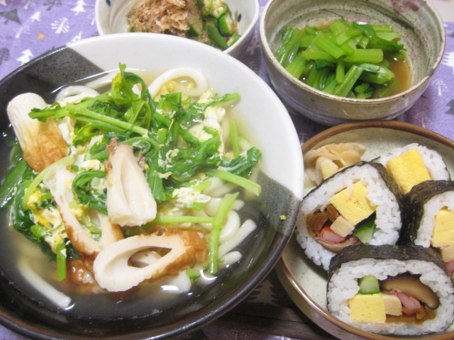 昨日はちょっと楽をしたかったので、うどんにしたんですが、それだとお腹がすくのも早そうだったので、出来合いの巻きずしをつけました。それに副菜として、小松菜の辛子びたしと、オクラのおかかポン酢がけで。