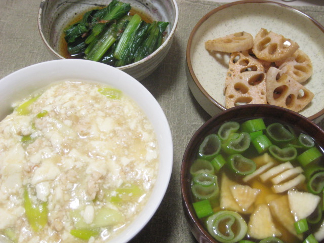 副菜は久々の青菜。小松菜のおひたしに、れんこんのジリジリ焼き。