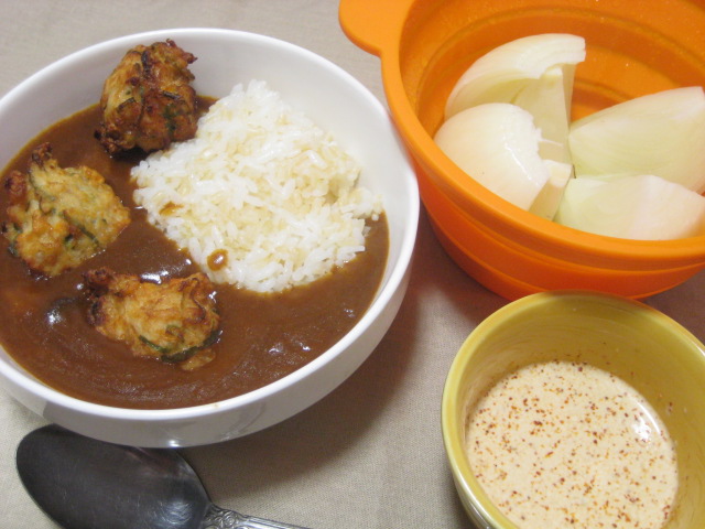 揚げ物はカレーライスのトッピングにしました。カレーは冷凍ストック分は既に消費してしまってたのでレトルトを。滅多に買わないんですが、何かの時の為に1~2個常にストックしてあったので助かった(苦笑)