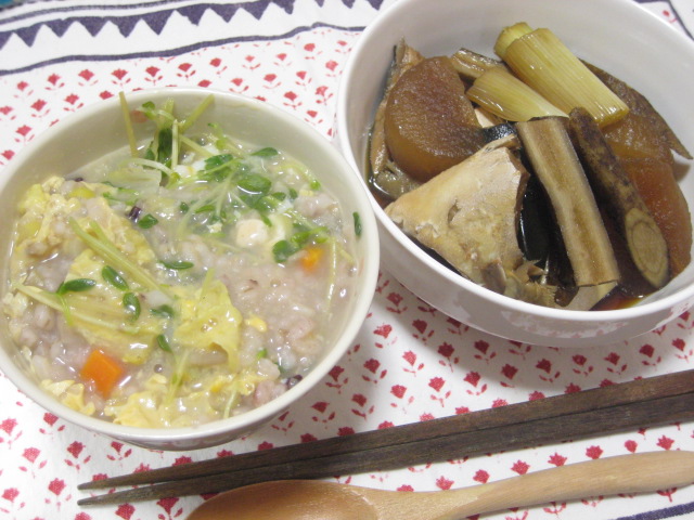 で、通常なら野菜の小鉢を一つつけて白飯…ってところなんですが、例によっての野菜高騰で小鉢にする葉野菜がないし、中途半端にいろいろ残ってきてる…ということで、全部合わせて雑炊にしてしまいました。これならハンパ物が一気に片付くということで(苦笑)
